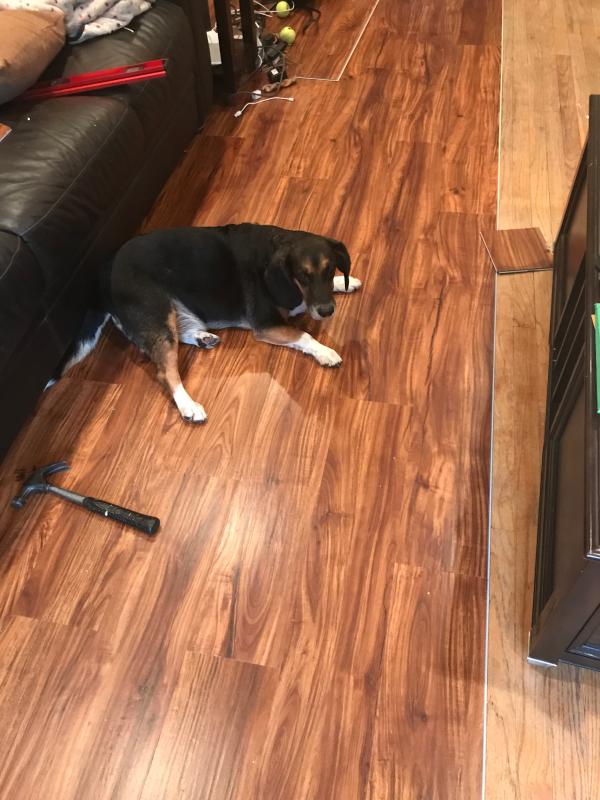 Dog running on hardwood floor close up inc jrny footsteps.